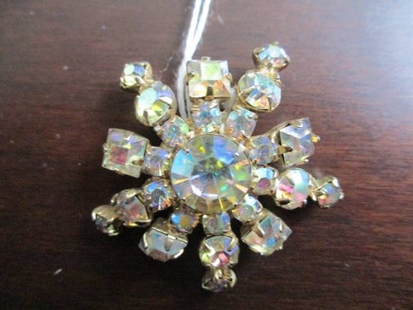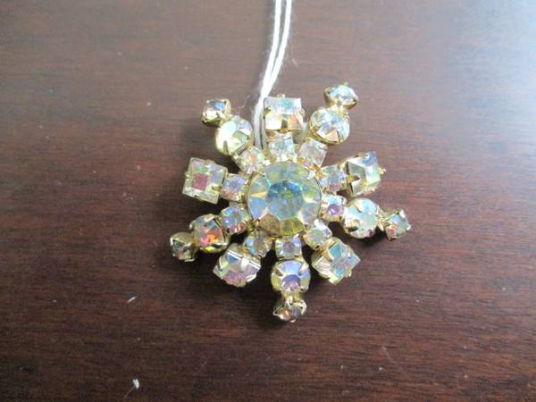 For sale is this faux diamond pin that belonged to my late grandmother. There's no markings on it so I don't know the brand. The metal is gold colored, but most likely not 10k or 14k. Just a nice vintage piece that measures 1 1/2 inches across. Only $19, cash only, please. Thanks for looking.