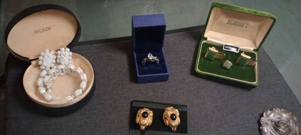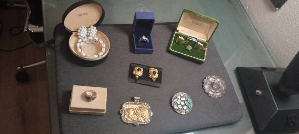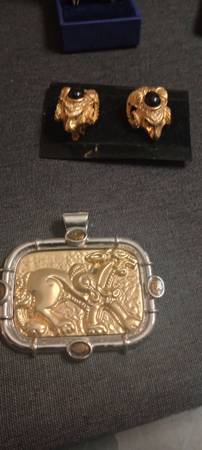 Prices start at $25 925 sterling silver ringwilling to do a bundle deal, Desmond's genuine Jade set $45, Hobie mid-century modern bracelet and earring set $60, retro gold-plated Rams Head earrings 1980s $45, medallion large rectangular mythical horse $60, vintage Western bolo turquoise and copper signed on back $75, antique budding Rose copper pen $40 and blue sapphire diamond crystal ring absolutely gorgeous with box $45