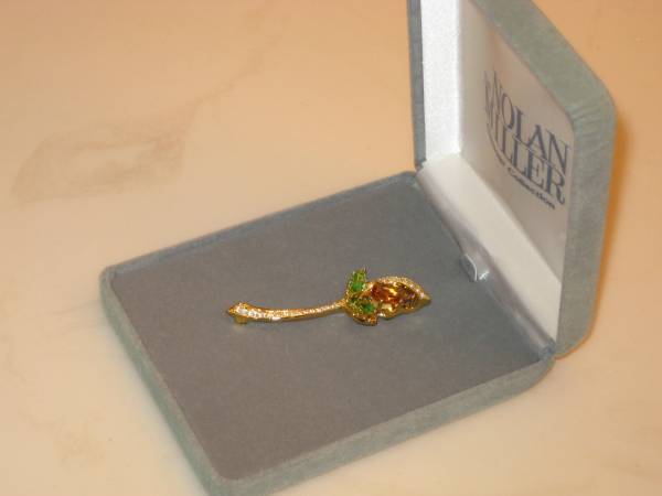 Nolan Miller Ultra Sleek Bud Pin. Orange/green stones and clear crystals. Purchased and never wore. Still in pouch with certificate of authenticity. Measures 2.5" long. Would make a great gift,...