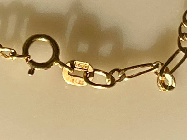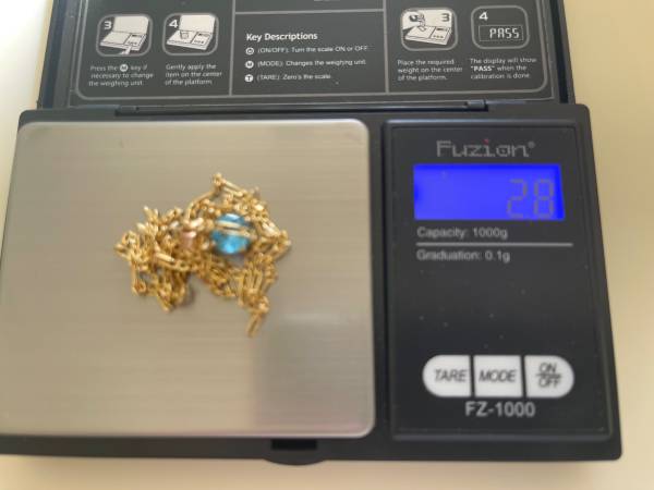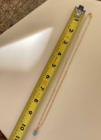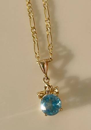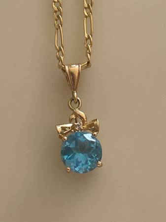 This necklace features a round faceted blue topaz pendant on a 18" chain, marked 14K Italy. The necklace weighs about 2.8 grams. Buyer to pay cash and pick up in Oceanside.