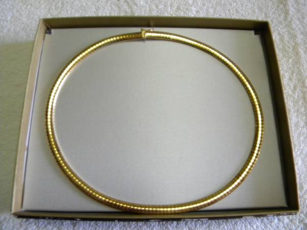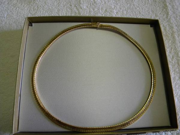 17" omega necklace with dual push lock and fold over safety clasp. 14kt gold over .925 sterling silver weighing 32 grams. The 3rd picture is the underside of the necklace. Made in ITALY, never worn and has been in storage for over 25 years. Reply by calling show contact info