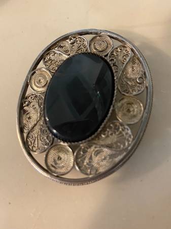 Antique Sterling silver filigree pendant with agate stone. Weighs 20.5 grams. Measures 2” x 1.75”. Great, intricate detail