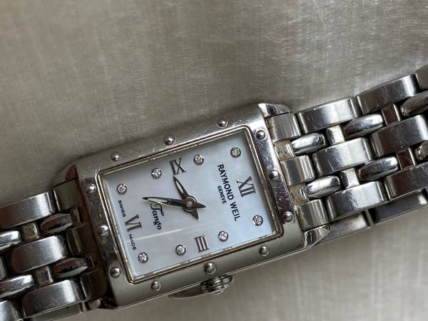 Raymond Weil Tango watch. Mother of Pearl Face and crystals. Will fit a 6” wrist or smaller. Ladies watch