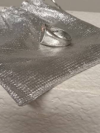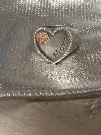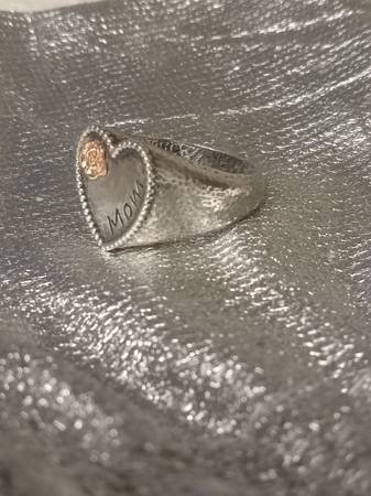 Mom engraved on sterling silver antiqued heart, with raised rose in rose gold, pebbled band. Size is technically a 7, but I believe because of the concave band, it may fit more like an 8. I have...