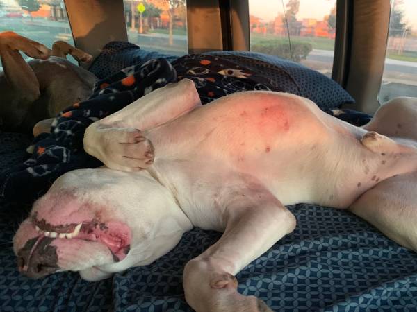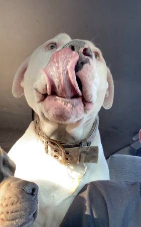 Lost white American red nose bully at the Planet Fitness gym this morning at 6 AM no collar since he was just going out for a quick pee. He Is micro chipped. His name is Mr. White. Please call show contact info