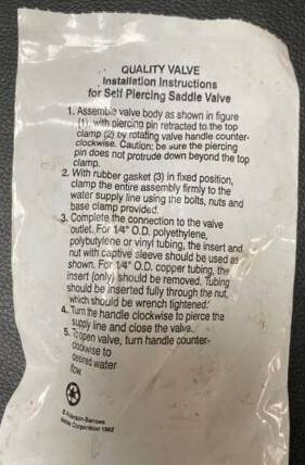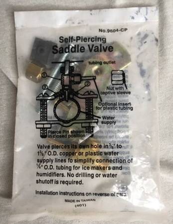 Watts Self Piercing Saddle Valve. 9604-CP 3/8” To 1 3/8” OD. New. In original packaging. For the refrigerator and ice maker water line. No drilling is required. Local pickup only.