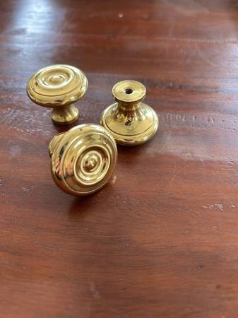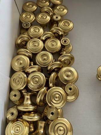 BRASS DOOR KNOBS for Kitchen or Bathroom cabinets. $ 1.00 each 28 pieces of 1 & 1/2" sizes 18 pieces of 1" sizes With screws. Excellent condition. Please call: