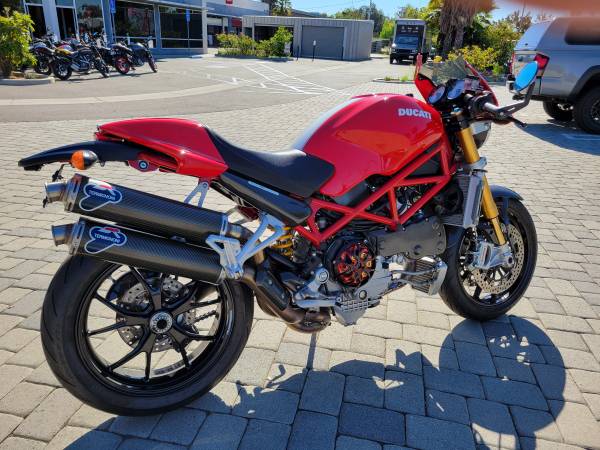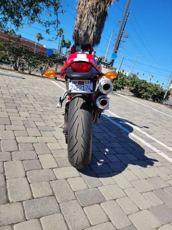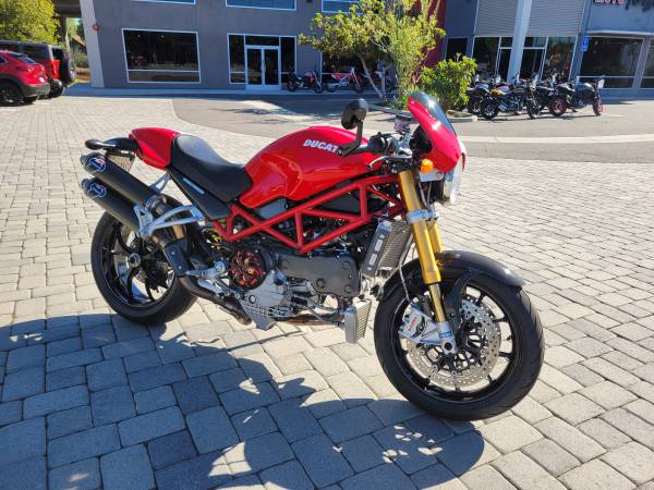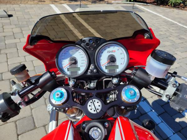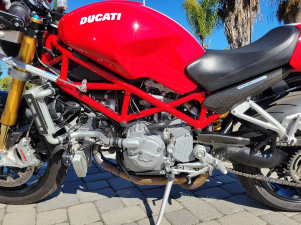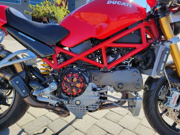 This iconic ride is loaded with premium upgrades: aftermarket triple clamp clip-on handlebars, carbon fiber Termignoni exhausts for that signature Ducati roar, an open-face SpeedyMoto clutch cover for a bold look, and an Öhlins steering stabilizer for razor-sharp handling and Rizoma bar end mirrors. This masterpiece blends stunning style with exhilarating performance. Perfect for enthusiasts craving a unique, high-performance Ducati.