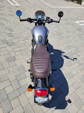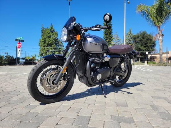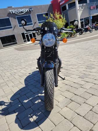 This stunning Bonneville T120 Black in Graphite/Matt Graphite only has 1,796 miles on the clock, this beauty is practically brand new! Featuring a bold straight pipe exhaust for that iconic roar. Perfect blend of classic style and modern performance. Ready to hit the road?