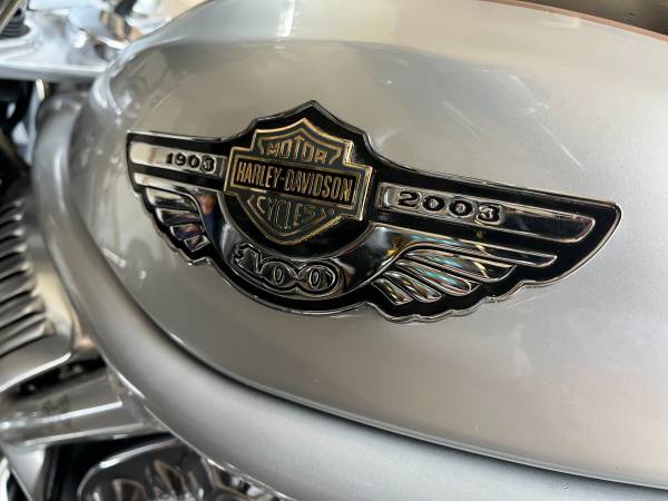 The 2003 100th Anniversary V-Rod features a 1130cc liquid-cooled, 60-degree V-twin engine producing 115 horsepower, a 5-speed manual transmission, and a belt final drive. It has a steel frame, a cartridge front suspension, twin rear shocks, dual 292mm front disc brakes, and a single rear disc brake. The bike is styled with a low, long, hot rod design and came with anniversary-specific features like unique badging and chrome accents.