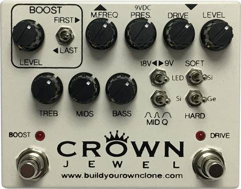 The Crown Jewel from BYOC is the ultimate drive and boost combo. It is not a clone of anything. It is an amalgamation of the best qualities from many different circuits to create something entirely new that is capable of producing a range of overdrive and distortion tones like no other analog pedal has before.