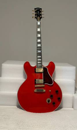 The lightly figured cherry finish with gold hardware and block inlays is out of this world. The BB King 490R and 490T pickups have incredible tone. The 6-way Varitone switch provides endless and super cool tonal range. This is an extremely well crafted and resonant instrument. The workmanship and attention to detail on this guitar is impressive. It plays and sounds fantastic and has zero playtime and zero fret wear.
