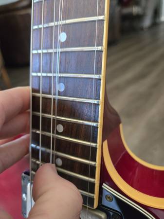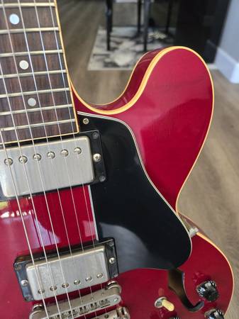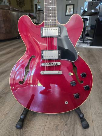 If you are looking at this post, you already know what it is. Very reluctantly I am offering my beautiful, vintage and original 1988 Gibson ES-335 Dot in the most beautiful and sought after cherry finish. What you don’t know is, this guitar is in really, really nice condition for a Gibson going on 40 years old. It looks and plays absolutely fantastically with no buzzing and low action. It has a very comfortable, thin neck and comes with the OHSC, original pickups, tuners, pickguard, hardware etc. The only thing that you could reverse, which I wouldn't, would be the strap locks. These are much better and obviously decrease the chance of dropping the guitar while playing very significantly. Gibson afficionados agree that the mid to late 80's ES-335 guitars were built very well, and are excellent guitars and now that they are vintage and considered classics, their value is only going up. They truly don’t make them like this any more. Honestly, it is very rare coming across a Gibson ES335 from the 80's in this color, all while being in really nice condition and an even better player. It is a light example, which won't burden your back or present a problem being played for a longer period of time. Unplugged, the strings ring out loudly and endlessly and is well above average and this is the way I determine the quality of my Gibsons. If it sound good unplugged, it’s a keeper, and this one goes beyond that. It has been set up, the frets are ready, fresh pair of strings (11's) and it is ready to rock. The top is absolutely amazing. Honestly, as stated before, here is that rare opportunity to purchase an almost 40-year-old Gibson ES-335 from a great year at a really, really good price compared to what other people are selling these for when they do appear and in much, much worse condition. Whoever purchases this is truly getting a special guitar and should consider themselves very lucky! Don’t let this one slip away as I know it will not last and I speak from experience. Due to the very attractive price, I know that I will be contacted a lot and with that said, I won’t be able to hold the guitar for anyone; it’ll be first come first serve. Furthermore, I reserve the right to end this sale at any time should my guitar sell locally or on other websites listed. I’ve described this guitar to the best of my ability. Please ask any questions you may have and I’ll try to answer in a timely manner.