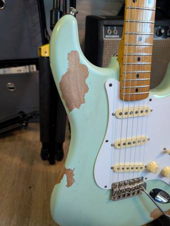 2009 Fender Classic Player 50's surf green Finish is flaking off the body. Callaham steel tremolo Waah Poblano pickups Raw vintage spring Emerson pots and caps Great player Pickup cash/zelle only...