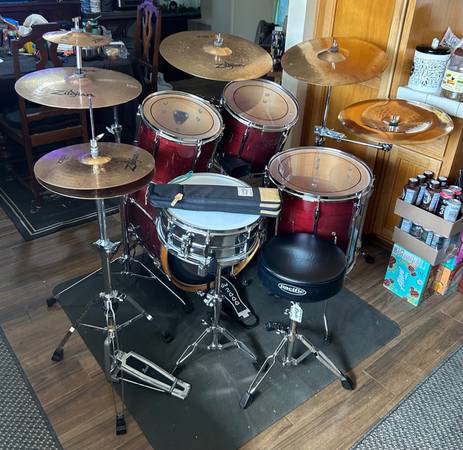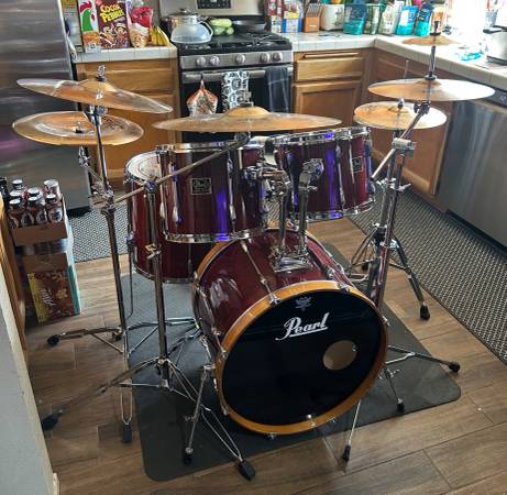 You are looking at a beautiful 5 piece set of drums made by Pearl. The set was made in the 90s. The model is Export Select Gold label and there was only a few made in assorted colors. The color is called Cranberry Mist. The shells are constructed of maple inner and mahogany outer. The finish is lacquer and is NOT a plastic wrap. The set has all brand new pinstripe heads and has been professionally tuned. The bass drum has both front and rear maple hoops! There are NO missing or broken parts at all on this set . . The set is 100% complete. The set sounds amazing and will be a great addition to any working drummers arsenal. Amateur or professional. The set comes with a complete set of 7 Zildjian ZBT cymbals all of the cymbals are in excellent condition and have no cracks or key holing issues! Most of the hardware is also made by Pearl and has no rust or corrosion at all. The bass pedal is a brand new DW 2000. Everything you see in the pics is included except my rug! The set comes with a Tama stick bag and has 4 brand new pairs of sticks of your choice and types of tips ! It also includes the tuning key on a lanyard for tuning. Let’s not forget the LP cowbell and mount and the Pacific by DW throne. Don’t forget to check out all of my other Listings here on Craig’s List for Great Drum Related items! I ONLY accept ZELLE or CASH as payment! Thanks for looking and have a great week! Don’t forget Christmas is almost here !