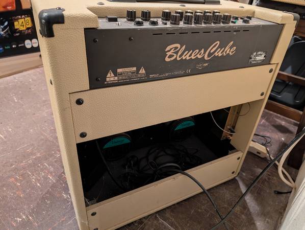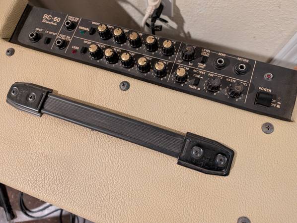 For your consideration is this incredible guitar amplifier. This is a Roland Blues Cube BC-60. A 60 watt solid state amp beautiful clean tones and gnarly overdrive channels. I've used it as a platform for my pedalboard and everything functions & sounds as it should. Loud enough to comfortably gig with and quiet enough to record. This beauty has lived in my studio for as long as I've owned it. Except for the small tear in the tolex, this amp is in mint condition and include the original foot pedal.