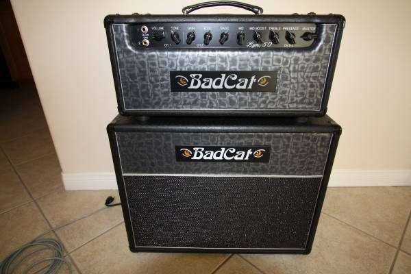 Bad Cat Lynx 50. With matching 12" cabinet, in excellent plus condition. Custom alligator tolex. 2 channel amp with foot switch. This amp roars. A super small cut in front of the speaker cab, about 3/16". You have to look close to even see it. Other than that, the amp looks brand new. Any questions just let me know.