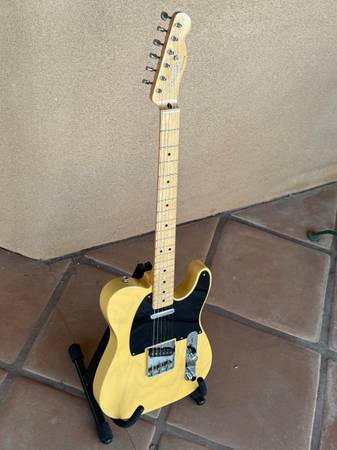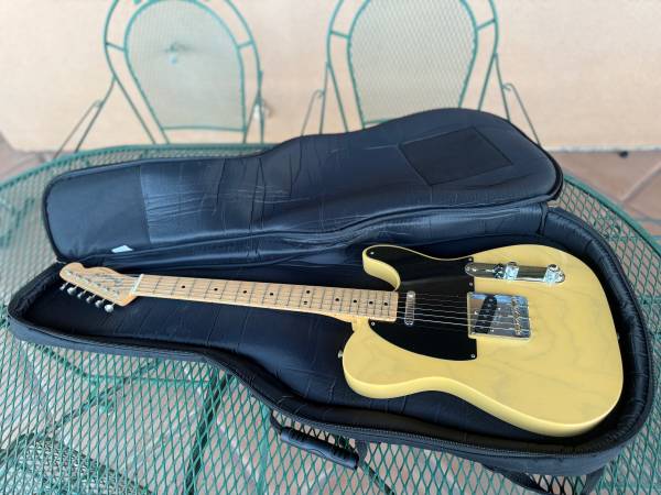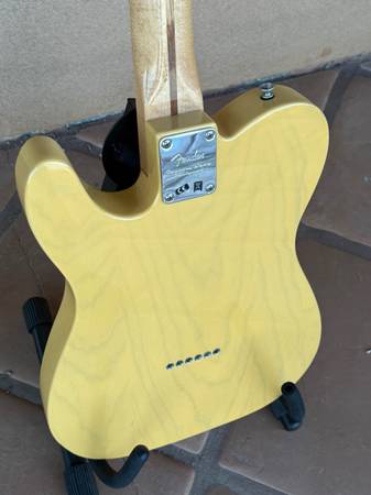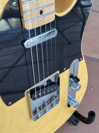 The Fender Baja Telecaster is a solid-body electric guitar with an ash body, a soft "V" shaped maple neck, and a 9.5" radius maple fingerboard. Key features include Custom Shop pickups (Twisted Tele in the neck, Broadcaster in the bridge), a 4-way pickup selector switch with an S-1 in the volume knob for extra tonal options, and a vintage-style 3-saddle strings-through-body bridge.