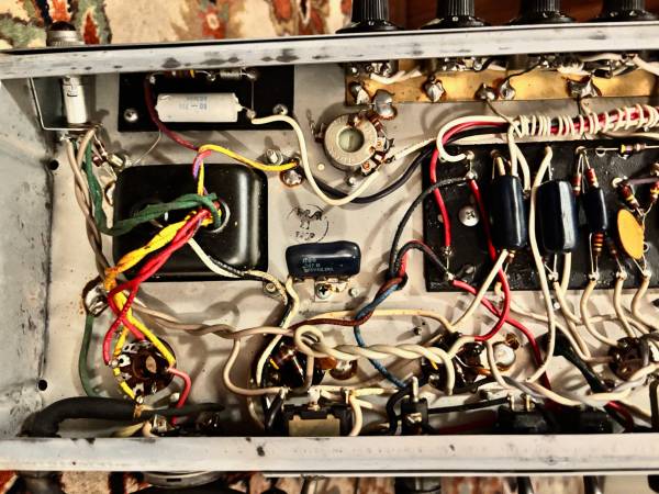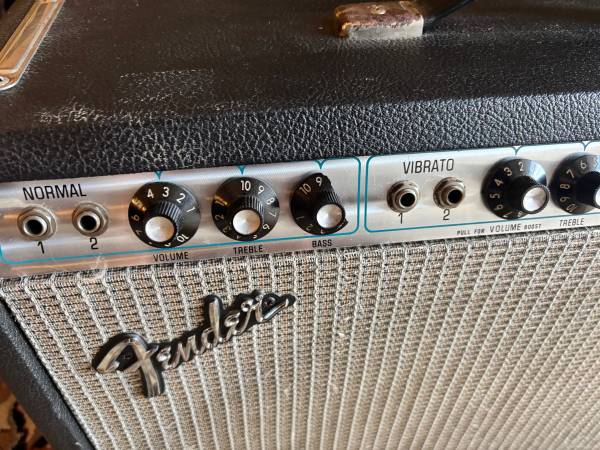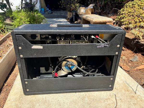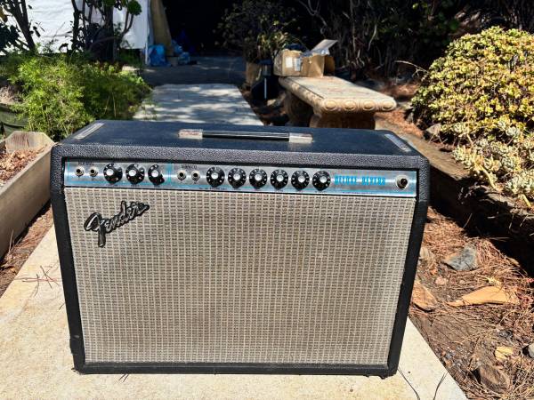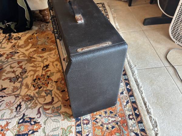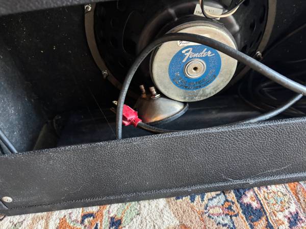 Circuit board has the post 71' Navy Blue almost black color Caps...(not the brown cat turds that sound good but fail more often) NO MONKEY SOLDER on the board..... Fender 'worked' up to Louder as they beefed up the OT, went to the 5U4 etc...after the last of the Blue Molded boards...... heavier magnet and voice coil on the stock speaker...All US tubes...orig footswitch , tolex and grill pretty nice... Reverb and Tremolo sound sweeet!!! A BIT OF RUST ON THE TWO STRAPS AND HANDLE BRACES>>>CHASSIS IS CLEAN!! Tube Chart intact....The amp is 'Loud' on 2.5.... the old saying is so true with Fenders..."If you don't get it on 3...DON"T GET IT!!!" Lol sorry no trades, sure you can get a used reissue for 8bills... when it breaks may as well buy another...