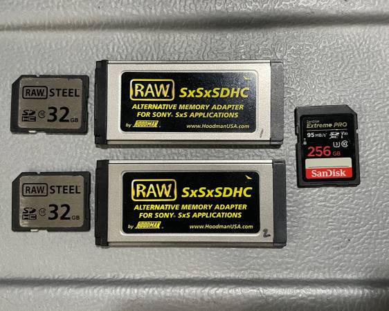 For recording I used 2 Hoodman SXSXSDHC Alternative Memory Adapters, so standard SD cards can be used instead of SXS cards.