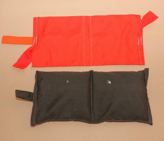 Both of these are heavy duty Cordura Nylon. The orange one is unused (empty )made by Mathews, 20” long, full length heavy duty strap sewn at both ends.You would have to sew the loose ends (shown) once you fill the bag. Very sturdy $20.00. The black one is filled, 13 lbs weight, 20” long full length heavy duty strap sewn at both ends. $25.00 A little bit of spotting on this one, otherwise excellent condition.
