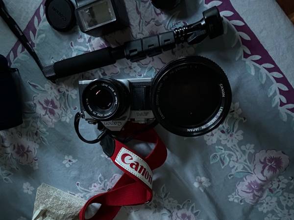 There is also a Sunpak auto 240 flash, Canon red camera strap and Wareway tripod.