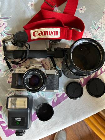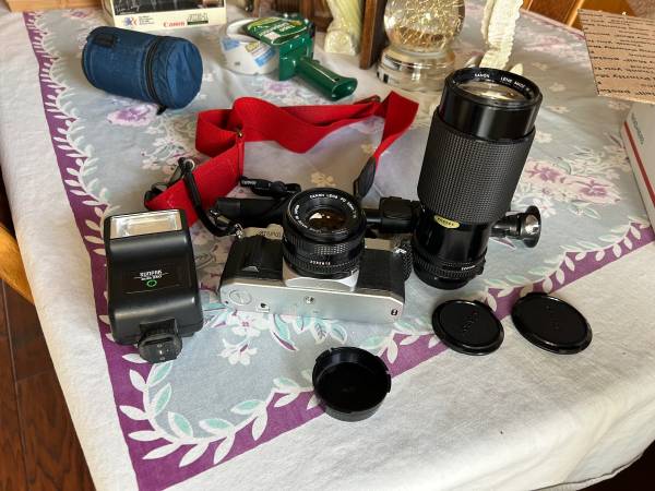 Canon AV-1 SLR 35mm camera and two lenses. Lenses are all made by Canon and made in Japan. Japan made Canon dates this offering to 1979. 50mm and 70-210mm zoom lenses.