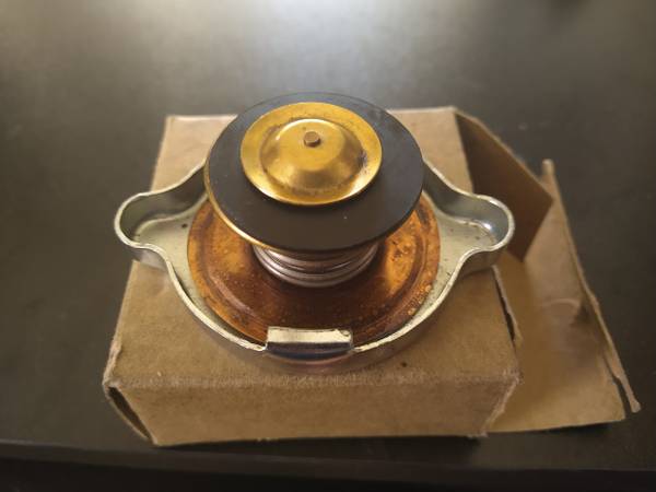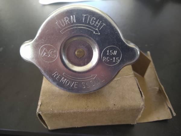 Correct radiator cap with solid rivet, new in box, has been in shelf since the 80's and shows discoloration due to age, but 100% good to install/use. Valley Center.