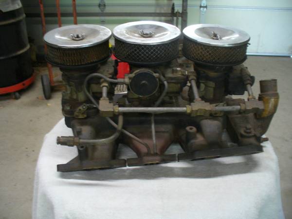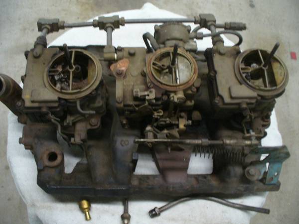 PONTIAC Tri power setup complete from a 1965 GTO 389. Also will fit 421 full size Pontiac. Has been stored indoors for over 20 years and will need complete restoration, it is NOT ready to be run. No cracks, no stripped threads, no helicoils, and no noticeable wear on the linkage or carburetor base-plates. Was $1450, now $1250 Call or email through C/L, ***NO TEXTS***
