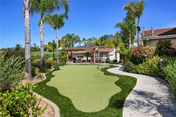 Step into a resort-style backyard designed for entertaining and relaxation, featuring a saltwater infinity-edge pool and spa with waterfall, cozy wood-burning fireplace, fire pit, outdoor bar, and a putting green. Whether hosting friends or enjoying a quiet evening, you'll be mesmerized by the panoramic sunset views over the hills.