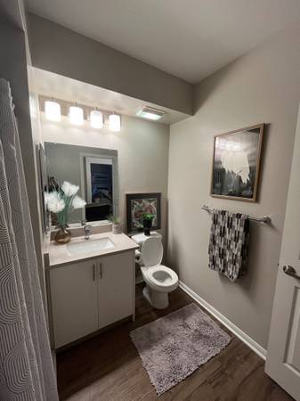 I am renting out one fully furnished large room in South Carlsbad for 1350Just marked down from 1450. It has a queen bed and a flatscreen TV even a mirrored closet and a hand painted desk!It’s a large room and the carpet is brand new.. The entire apartment has just been renovated so all new appliances and the cupboards are white and the wood floors are gray. It’s very upscale, located on the second floor so we have two balconies a large pool, a gym, barbecues and a relaxing rock fireplace. The apartment is centrally located 10 minutes to the beach, seven minutes to the freeway and surrounded by all kinds of cute restaurants and coffee shops, even three grocery stores. We also have public transportation that’s right out front. Call me to arrange and meet and greet show contact info