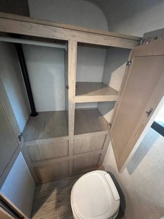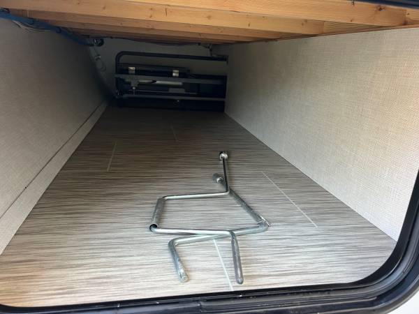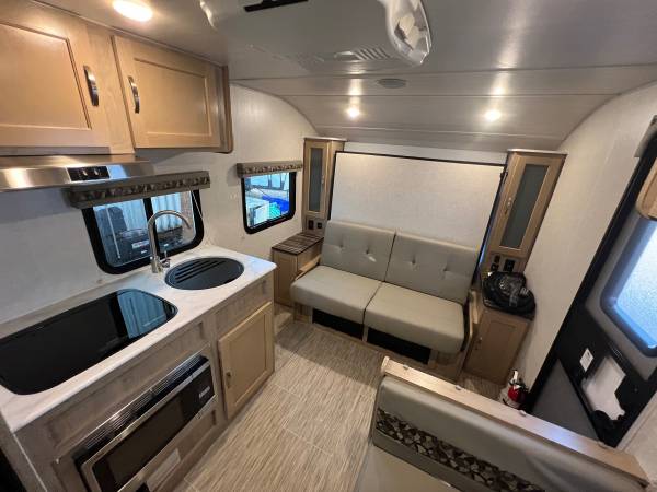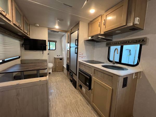 Sleeps Three, 60"X 74" Queen Murphy bed, Sofa, Convertible dinette, Two burner stove, Microwave, 6 cu ft Refrigerator electric/propane, Optional Exterior kitchen, 24 in television, Interior speakers, Radio, USB Charger ports, Air conditioner, 11 ft power awning. Holding Tanks; Fresh water: 30 gal, Gray water: 30 gal, Black water: 30 gal.