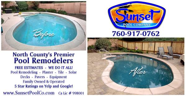 If your swimming pool is looking old, outdated or has fallen into disrepair, you don't have to live with it. Let us transform your pool into one that you love. We do everything from replastering to complete backyard make overs. We can make your dream pool a reality. . . your options are as broad as your imagination. Call Sunset Pool Company at 760-917-0762 today to make your backyard dream a reality! We are your one stop shop for all your backyard remodeling needs! We have ONE crew that can do everything, no need to deal with a bunch of subcontractors. You've found the one company that can DO IT ALL!