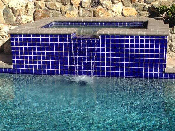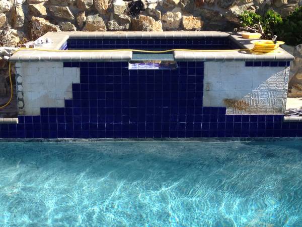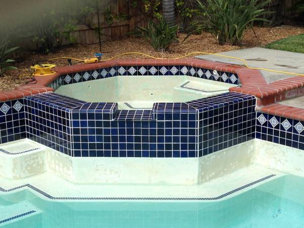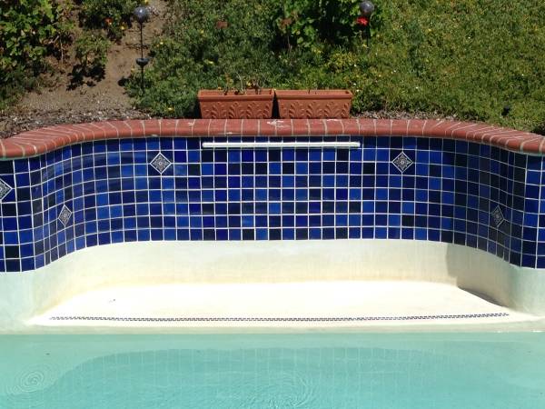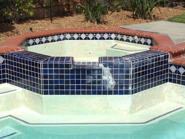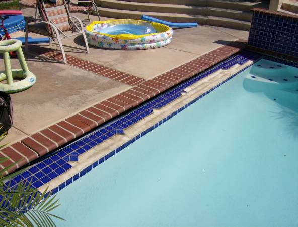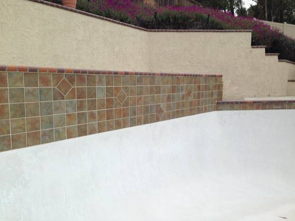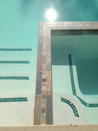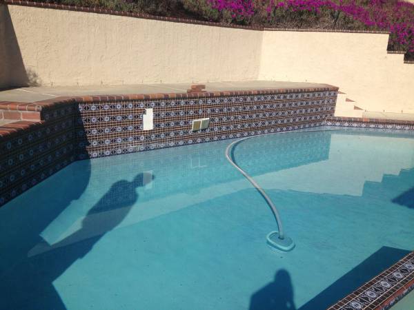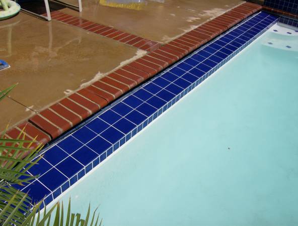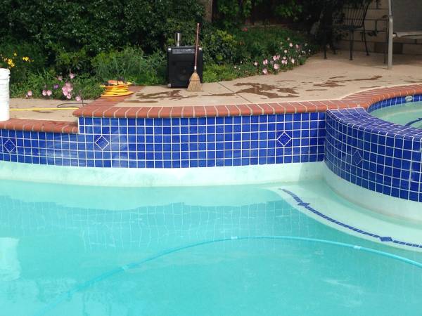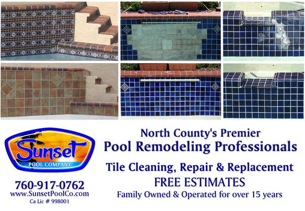 Is your pool tile looking dull and dirty or does it have a thick white build up on it? Sunset Pool Company can help! There is no need to retile your whole pool. We can clean it up without blasting or any harsh abrasives so there is no damage to your tile or plaster. Known as efflorescence, mineral salts such as calcium and magnesium may come out of the grout, artificial and natural stone coping, or from the setting mud and deposit on the front of the tile. It may also originate from the pool water from improper chemical balance or from residue left by evaporated chlorine. After a few years it will build up to become an unsightly blemish on your otherwise beautiful pool. Give us a call and we will be happy to give you a FREE estimate.