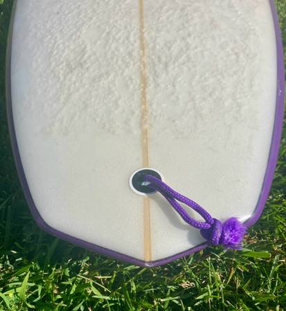 6’4” x 19-7/8 x 2-7/8. Amazing condition. No dings. Custom original color resin-tint bottom, with cut-lap solid purple rails and a clear deck keeps your wax cool. Beautiful shape and glass job. Made in Huntington, CA.