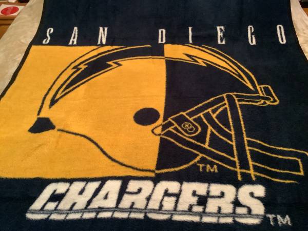 Selling a NFL San Diego Chargers blanket in very good and clean condition. Photos of blanket is taken over a California King size bed or use as throw blanket.