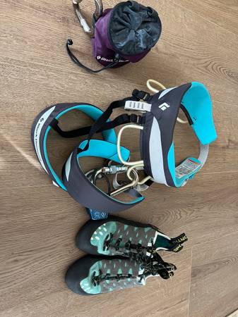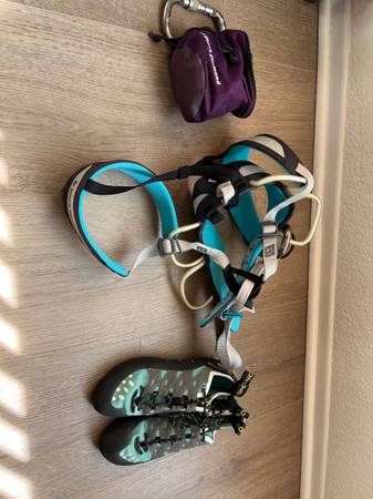 Everything sold together as a set, great deal! Women’s black diamond harness size small like new Waist specs 28-31 in Leg loops 20-23 in Comes with a carabiner and belay/rappel device La sportiva...