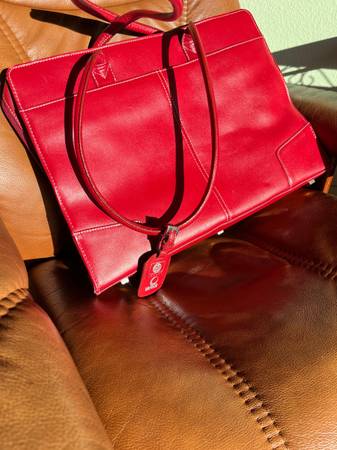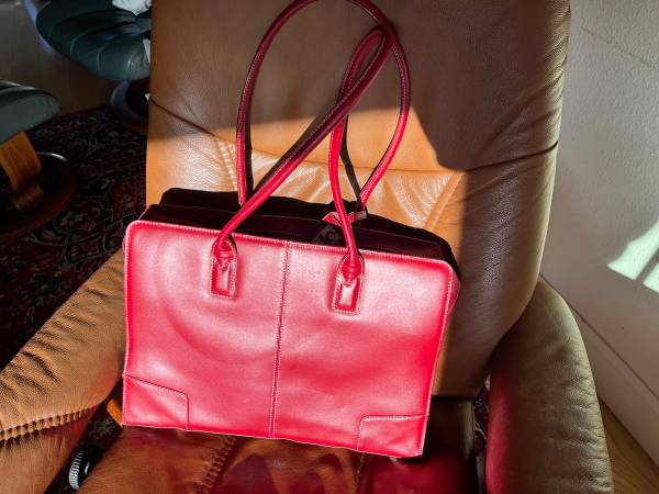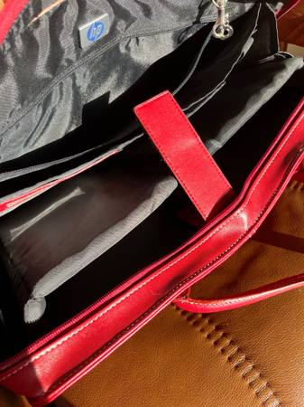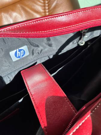 Beautiful red leather laptop brief case (HP). Like new. Never used. Still smells like new leather. Made by WB (Women In Business) for HP) Padded inside for 15” laptop or Apple iPad. One zippered compartment, one very large compartment, a cell phone compartment (fits my Apple 13) and a smaller Velcro compartment) a place to attach keys, and a Velcro attachment to keep your computer steady. Impeccable stitching.