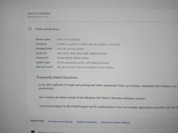 Alienware Area R2 i7-5930K 3.5hz 16GB RAM New 500GB SSD+1TB HDD W11 8GB GTX 1070 - $550 (Oceanside)