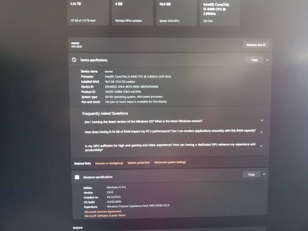+ Dell XPS 8930 Intel i5-8gen 6cores CPU 9MB Smart Cache boot to 4.0ghz, only 65W so it doesn't get hot too much when you play games. 4GB Nvidia GeForce GTX 1050Ti with HDMI- DPs so you can connect to 2-3 monitors together. Fast boot to Windows 11 Pro lifetime warranty, clean inside without dust on board and fans. Some scratches on the case but not an effect on the system. Passed all testing from Dell, upgraded the newest bios version.