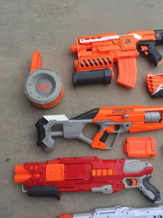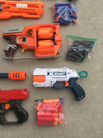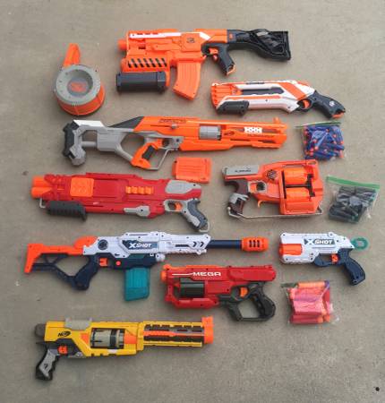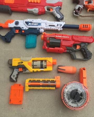 Great assortment of Nerf and N-strike and Mega dart blasters. X shot blasters too! Extra magazines, including large capacity drum. Bags of darts included. All blasters and accessories tested and...