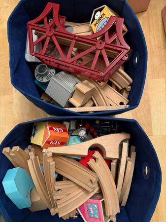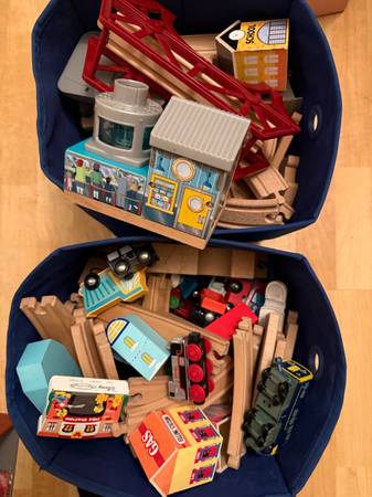Lightly used. Mixture of mainly wood train tracks and trains. A few plastic trains and pieces. Mixture of different eras mixed in bundle. $100 OBO
