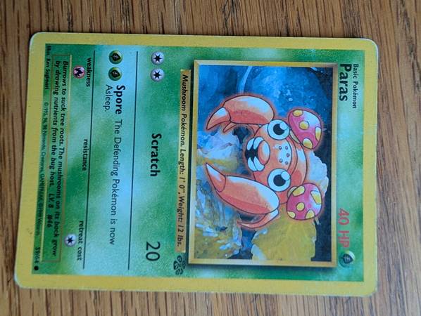 Basic Pokémon card featuring Paras with 40 HP. I am cleaning home. Please see my other listings. If you buy more than one item at one time, get all for 10% off.