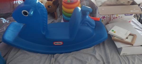 Toddler slide, and blue rocker, and stacking toy All together $25 Separate 10$ each. You pick uo Cash only If you ask to pay with checks you will be blocked. Email me Thanks!