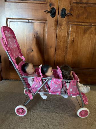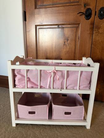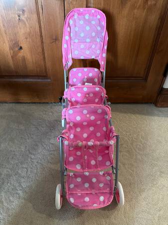 Badger Basket wood doll crib and triple doll fold up stroller both in great/excellent condition. Crib features pink/white gingham print bedding accessories; bumper, mattress/pillow, blanket and 2 storage baskets. Triplet fold up stroller is in pink/white polka dot print and features 3 seats for dolls and an over head shade. Pictured are American Girl Bitty Baby 16” dolls for reference only (not included in listing). These pieces are perfect for endless hours of pretend play and priceless memories for your little one!