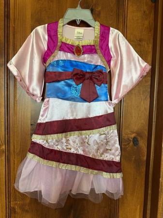 New without tags, Disney Store, Mulan kimono dress costume in size 2/3. This stunning mix color/fabric Mulan dress features gold glitter designs, a blue oriental with burgundy bow mock sash, glitter tulle and a rhinestone/glitter Mulan cameo. A must see, pictures do not do this beautiful costume justice. Perfect for a party, trip to Disneyland, Halloween costume or imagination play!