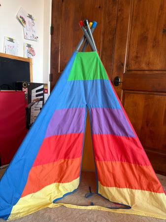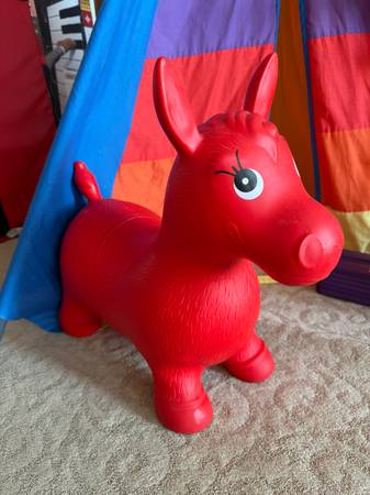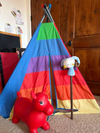3 pcs pretend play lot, all in great condition. Included are: - collapsible fabric tent - ride on inflatable donkey - IKEA goat stick animal Please check out my other listing of like new items!