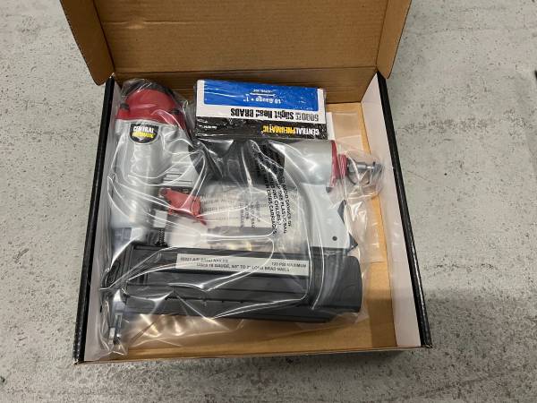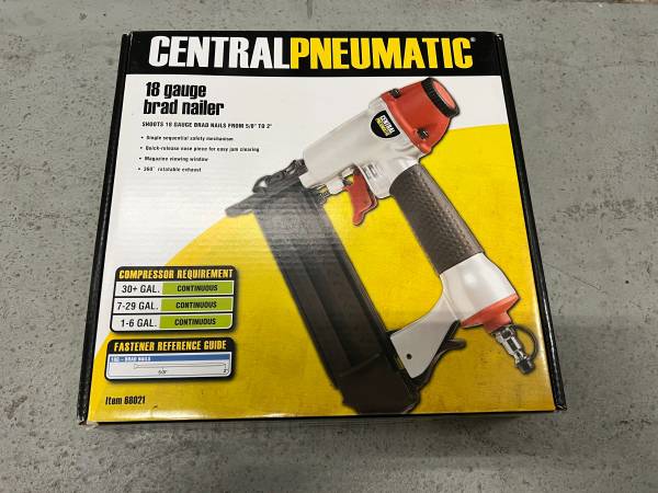 Central Pneumatic 18-gauge brad nailer, brand new and never used. Sealed in original packaging with all accessories included. Shoots 18-gauge brad nails from 5/8" to 2". Features a quick-release nose for easy jam clearing, magazine viewing window, 360° adjustable exhaust, and single sequential safety trigger. Requires an air compressor (1–30+ gallon compatible).