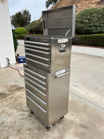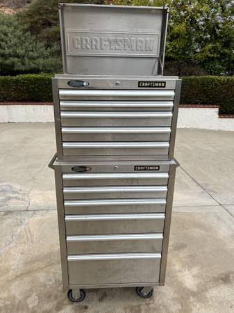 Selling a Craftsman stainless steel rolling tool chest with top and bottom cabinets, in good condition. Heavy-duty construction with smooth-rolling casters makes it easy to move around your garage or workshop. Multiple drawers provide organized storage for all types of tools and accessories.