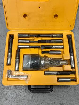 Grizzly model G9324 3" boring combo set with R-8 shank, brand new and never used. Includes boring head, shank, multiple boring bars, and Allen wrench in original molded carrying case. Designed for precision boring operations on mills. All components are clean, unused, and still wrapped for protection.